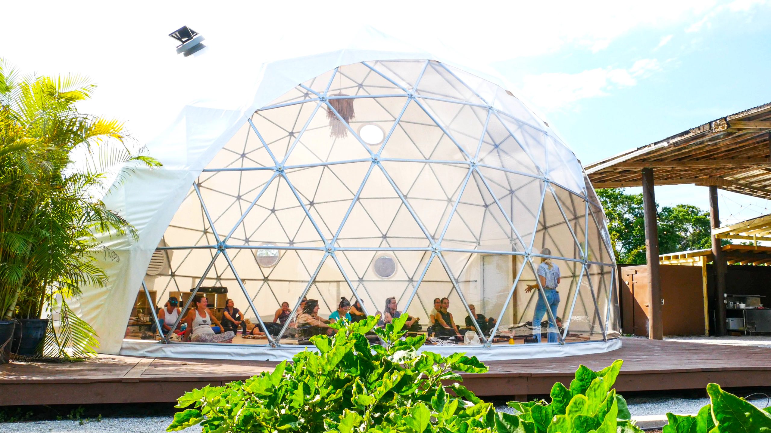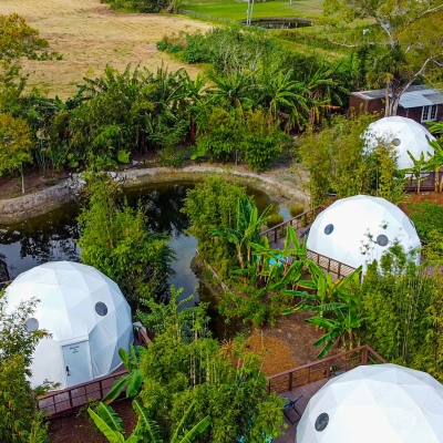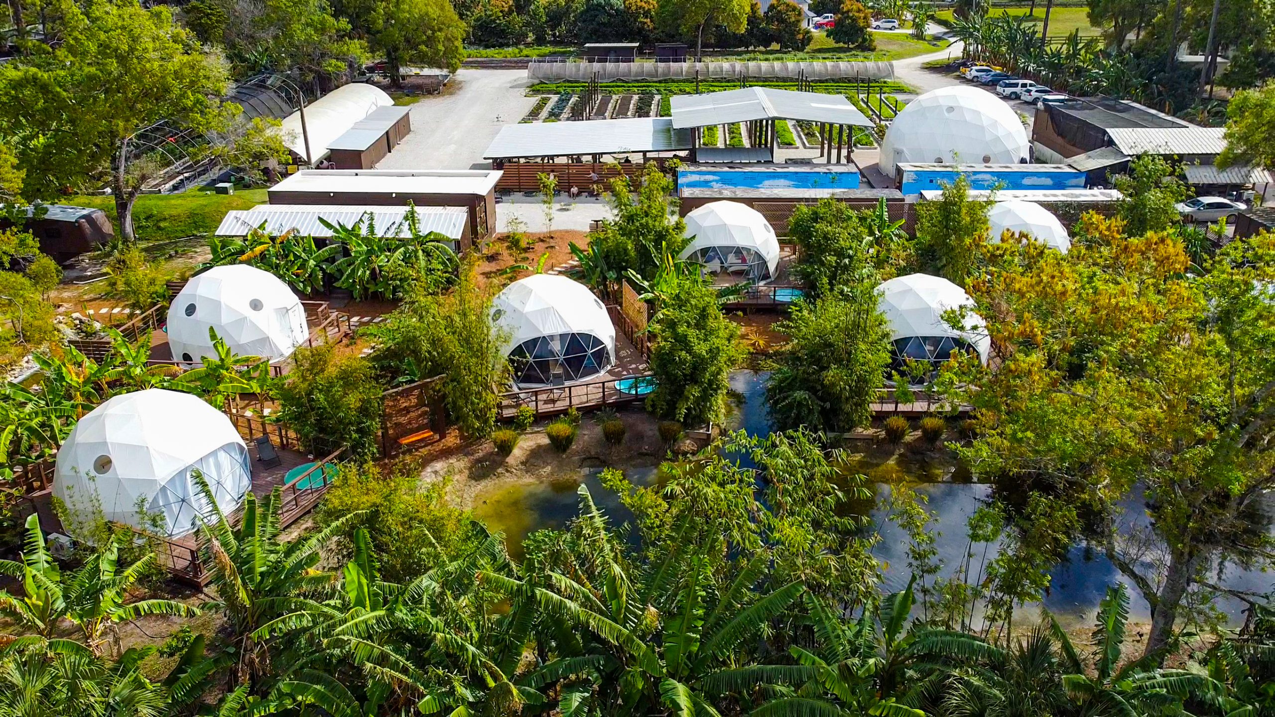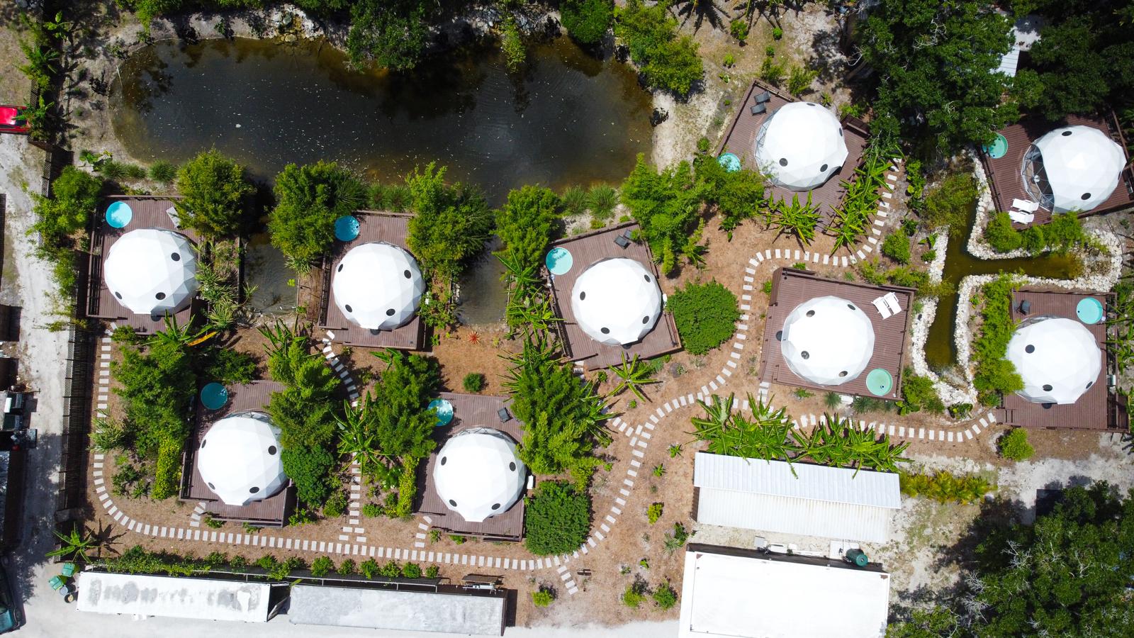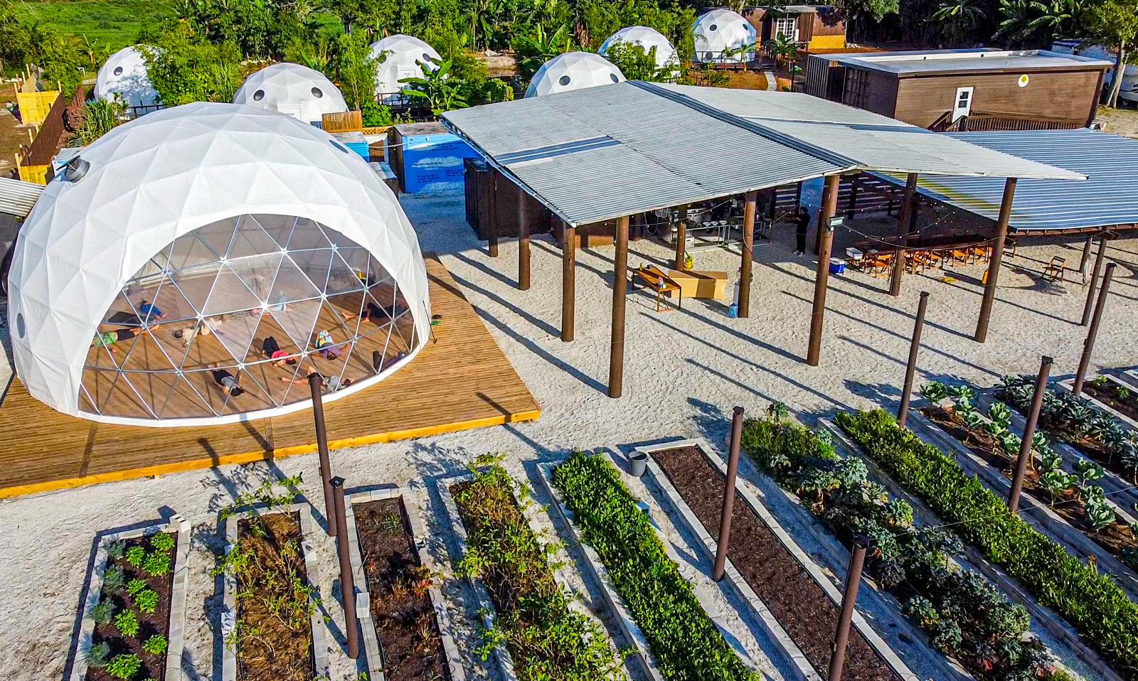 Accommodations for Up to 18 Guests: Glamping domes, tent cabins, and a private host suite.