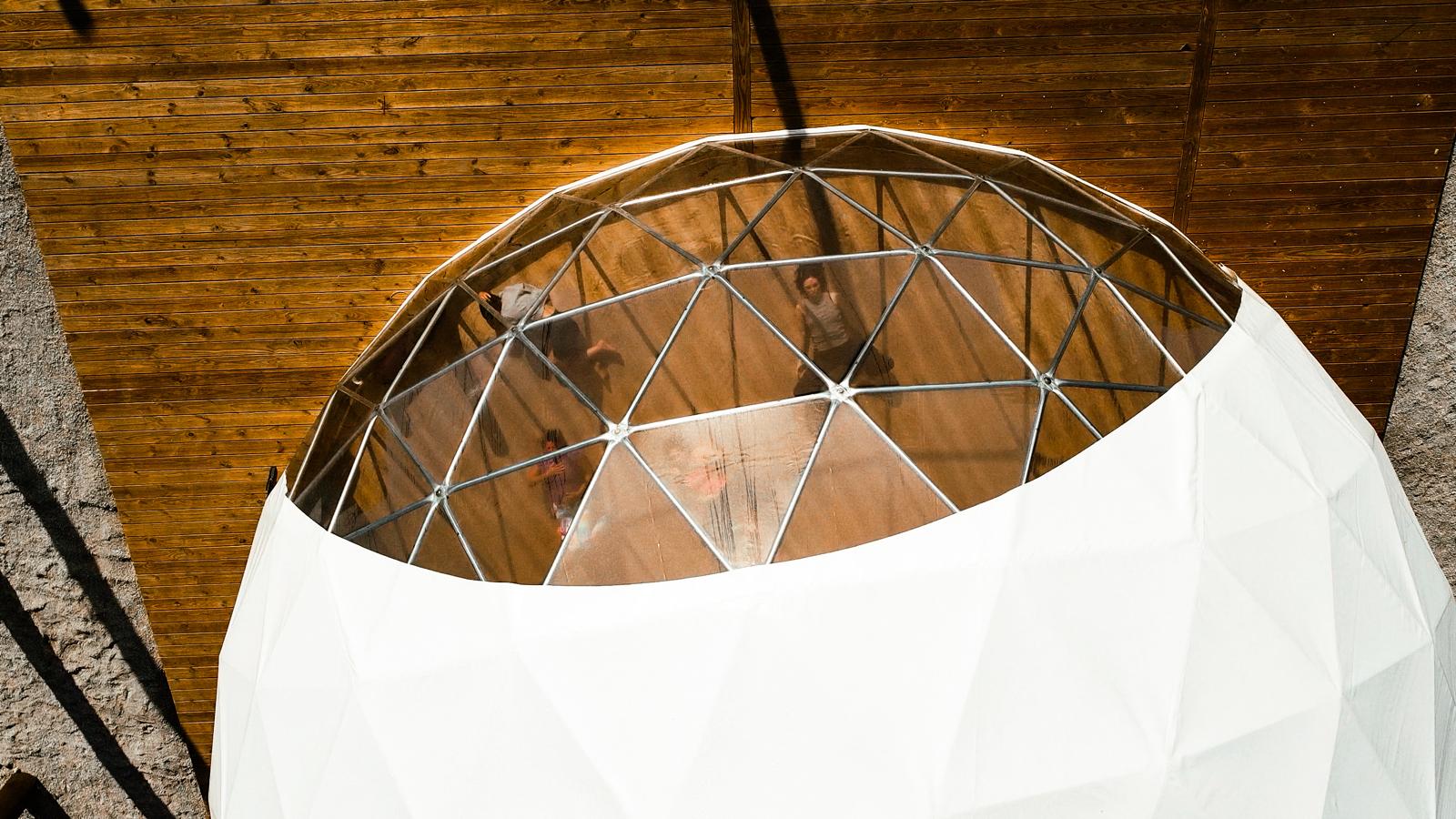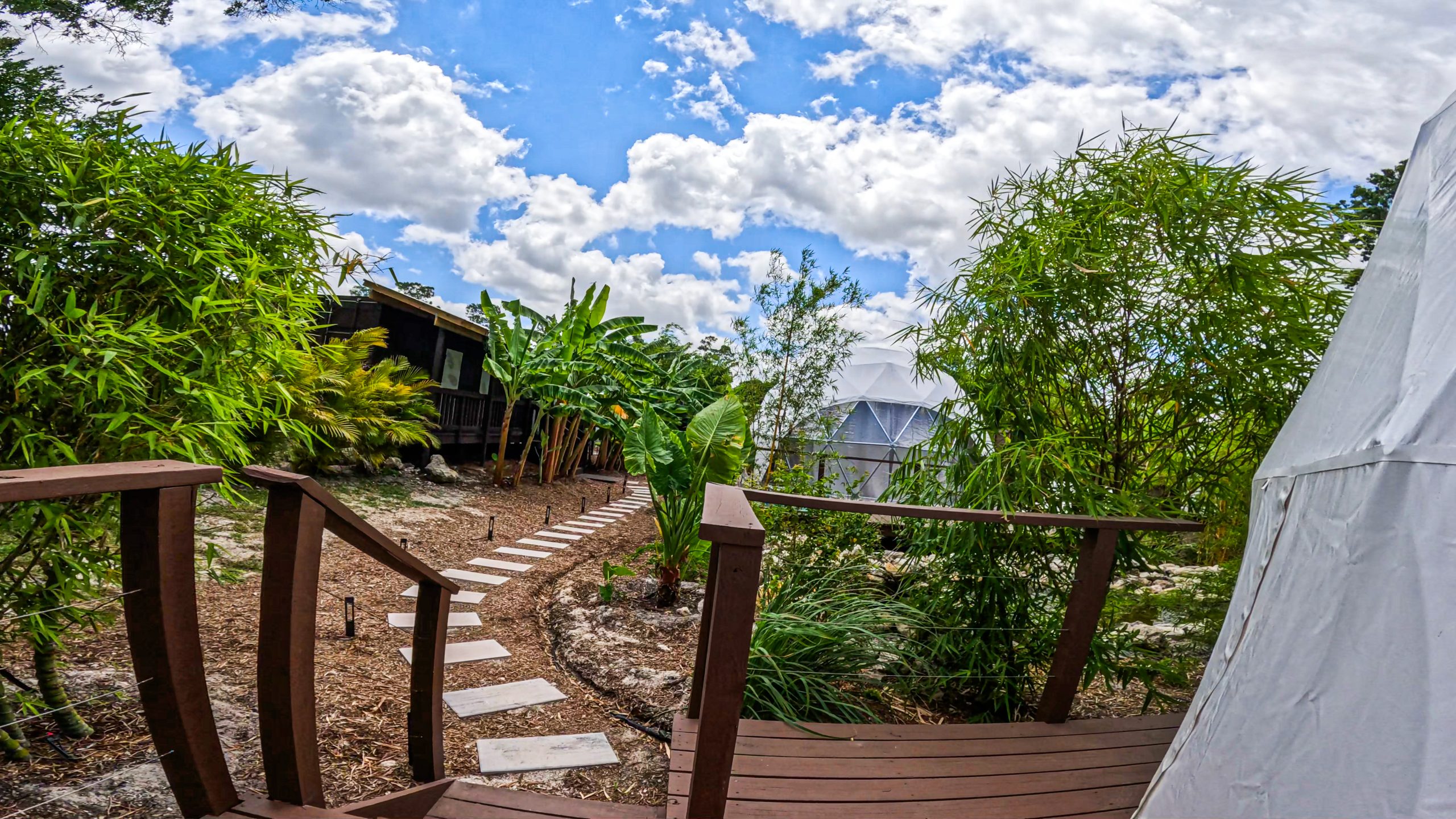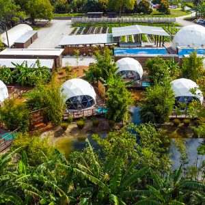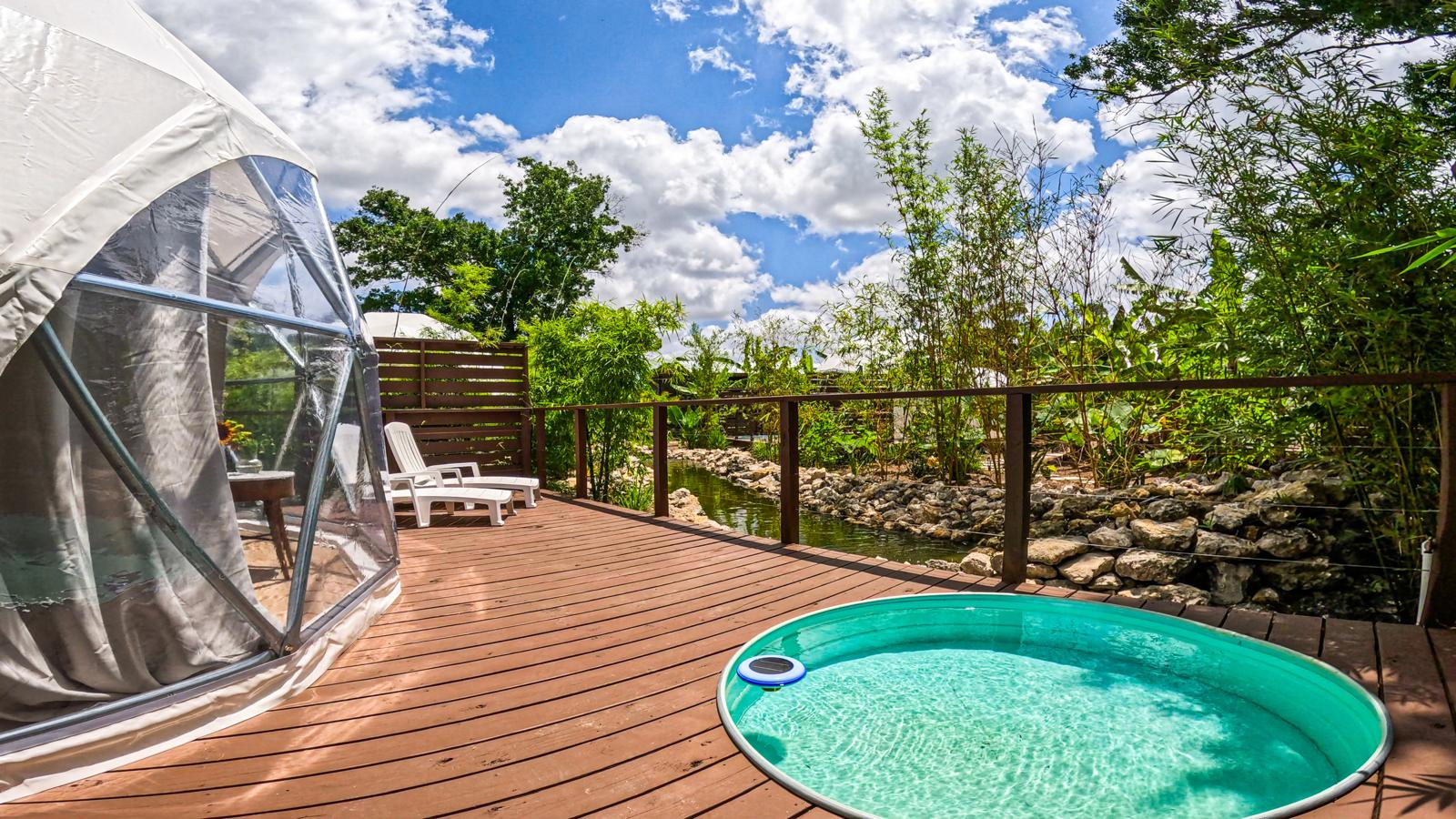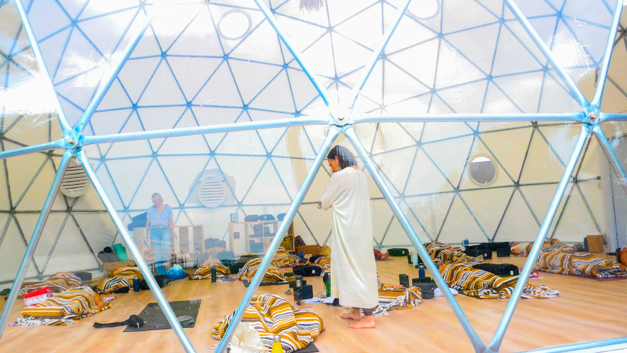 Accommodations for Up to 18 Guests: Glamping domes, tent cabins, and a private host suite.